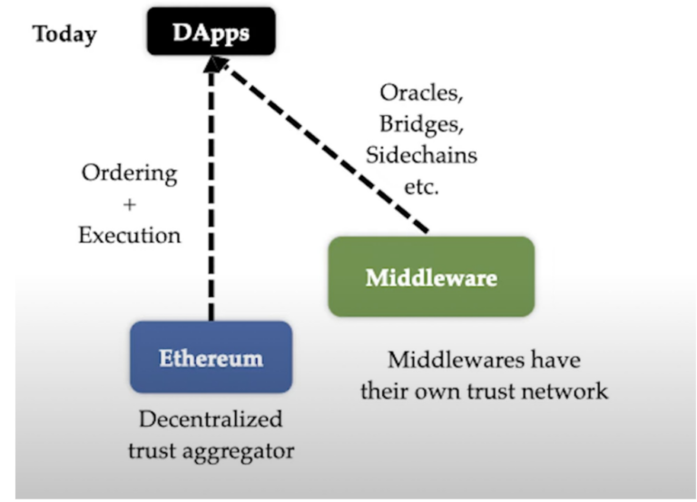 A significant issue that arises during the creation of robust cryptoeconomic networks is the challenge of fragmented security. This predicament is particularly prominent within the Ethereum network. Broadly speaking, middleware and applications outside the realm of the Ethereum Virtual Machine (EVM) constructed atop the Ethereum network are tasked with establishing their individual web of trust. This approach is laden with inefficiencies. The initiation of security demands substantial expenses, drains resources, and requires a considerable amount of time. Furthermore, once initiated, the process of upholding and expanding a decentralized security framework is a continuous process. With the growth of new applications, the integrity of cryptoeconomic security becomes progressively scattered across the network. Each application has its own security and trust assumptions, many of which compromise the assumed security “guarantees” of Ethereum. As a result, non-EVM middleware obfuscates the users from the very thing that drove them to Ethereum in the first place.